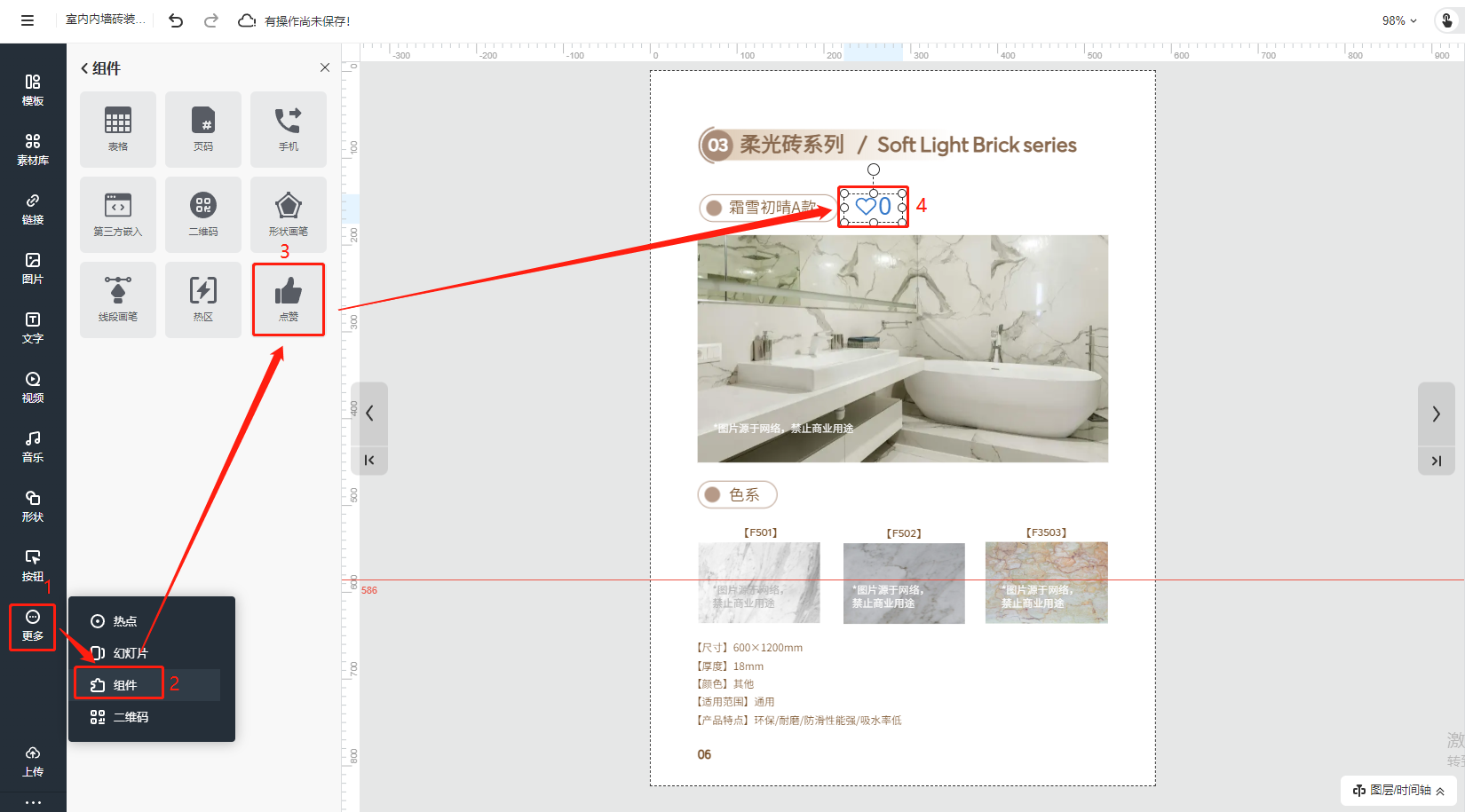 點(diǎn)擊【更多】,然后選擇【組件】,再點(diǎn)擊【點(diǎn)贊】,在頁面中會(huì)出現(xiàn)一個(gè)點(diǎn)贊按鈕,點(diǎn)擊可拖動(dòng)調(diào)整位置。