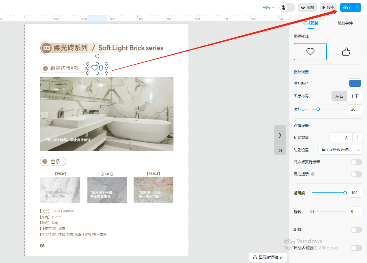 選中頁面上的點(diǎn)贊按鈕,設(shè)置點(diǎn)贊的樣式、透明度、位置和大小、旋轉(zhuǎn)。
