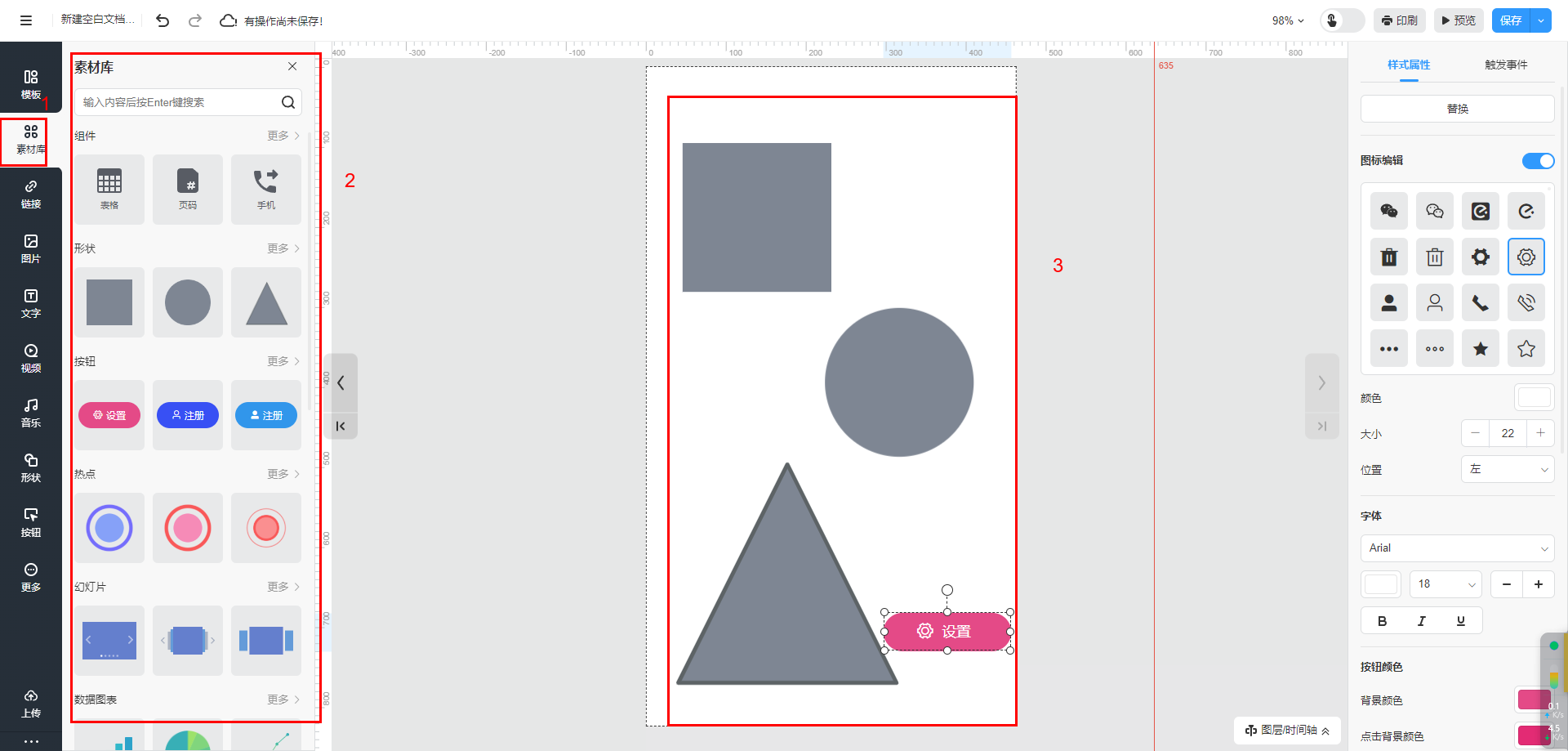 選擇【素材庫(kù)】進(jìn)入素材界面,選擇素材類(lèi)型,單擊/拖拽素材添至電子書(shū)頁(yè)面,并可設(shè)置素材顏色、位置、大小等。