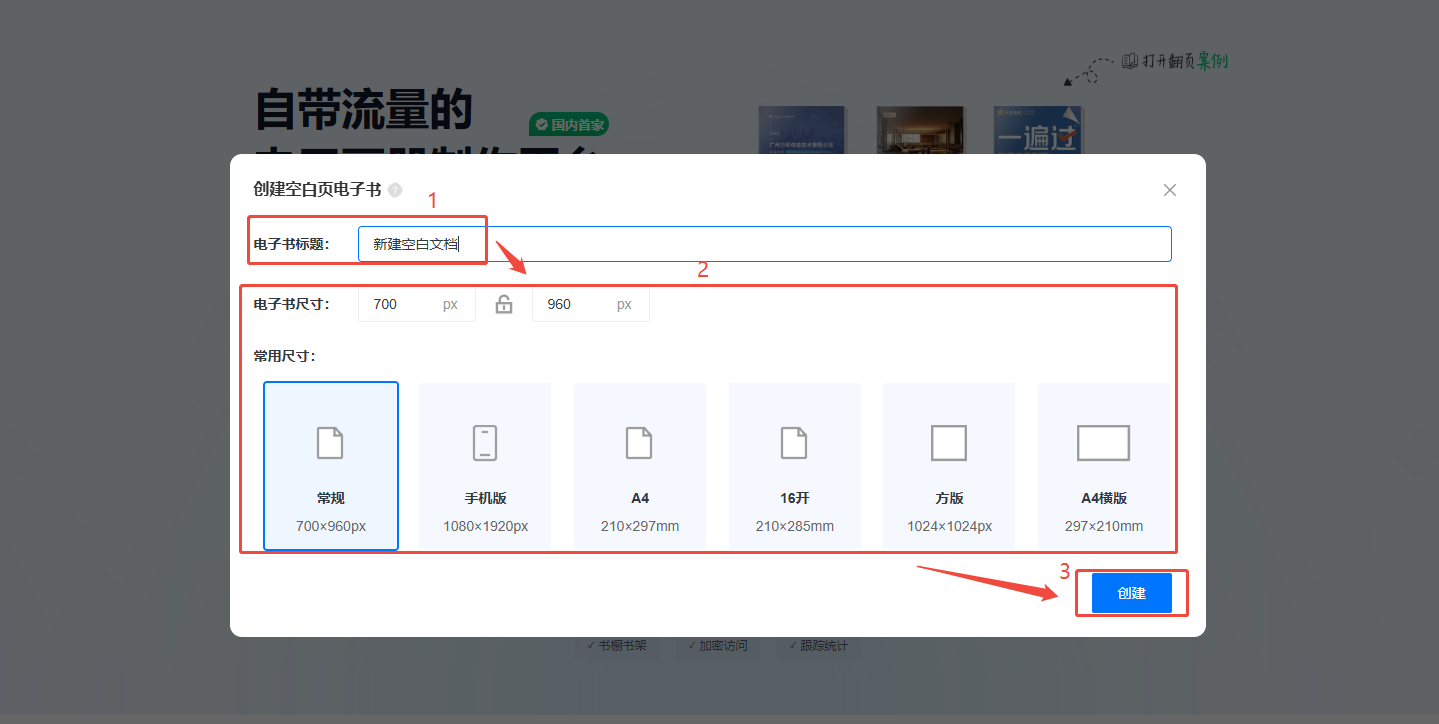 輸入電子書(shū)標(biāo)題并選擇尺寸,并點(diǎn)擊【創(chuàng)建】。在這里設(shè)置標(biāo)題與尺寸,你可以選擇平臺(tái)預(yù)設(shè)尺寸,也可以根據(jù)需求設(shè)置你需要的尺寸大小。