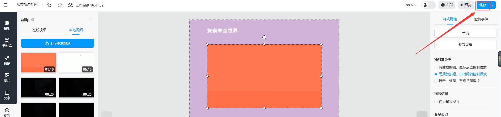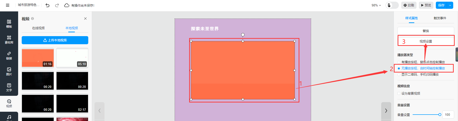 選中本地視頻,選擇【無(wú)播放按鈕,由時(shí)間軸控制播放】,然后點(diǎn)擊【視頻設(shè)置】