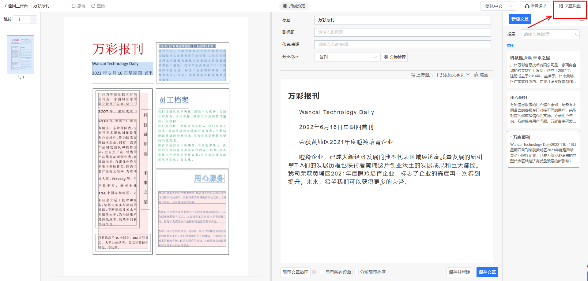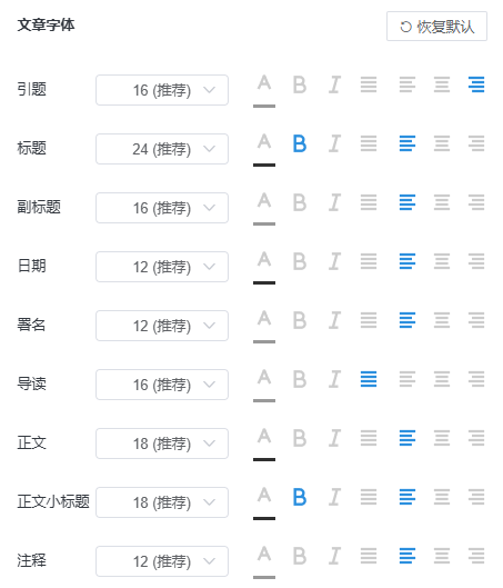 文章設(shè)置,可以對(duì)文章的頭尾部展示圖,字體大小,間距,熱區(qū)顏色進(jìn)行配置。