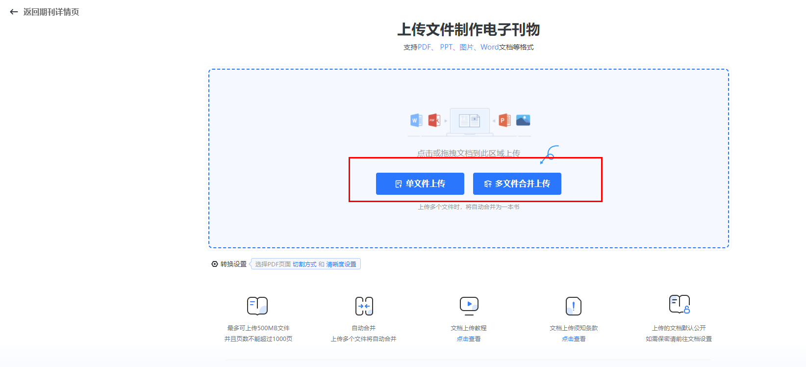 (2)點(diǎn)擊【單文件上傳】/【多文件合并上傳】,選擇刊物文檔上傳