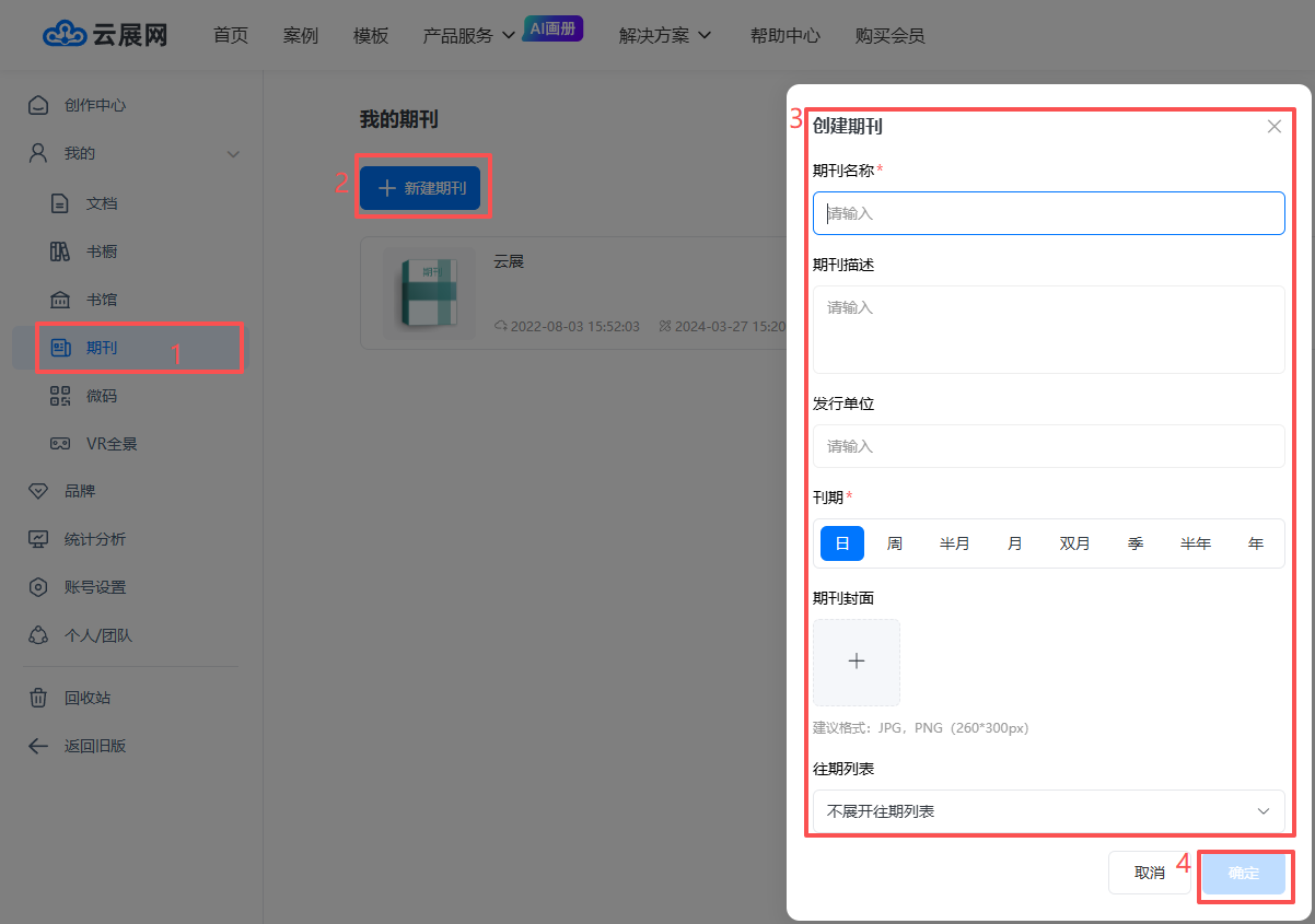 點(diǎn)擊【期刊】,點(diǎn)擊【新建期刊】,輸入期刊名稱,描述,單位,刊期(如日刊選日),封面,也可以設(shè)置是否展開期刊往期列表,設(shè)置好后點(diǎn)擊【確定】。