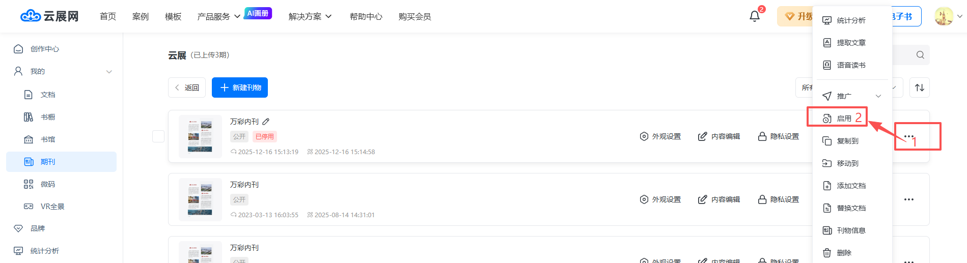 如果想晚點(diǎn)發(fā)布,可以先不點(diǎn)發(fā)布本期,確定發(fā)布了后,到【管理期刊】頁面,點(diǎn)擊右邊的【…】按鈕,點(diǎn)擊【啟用】。