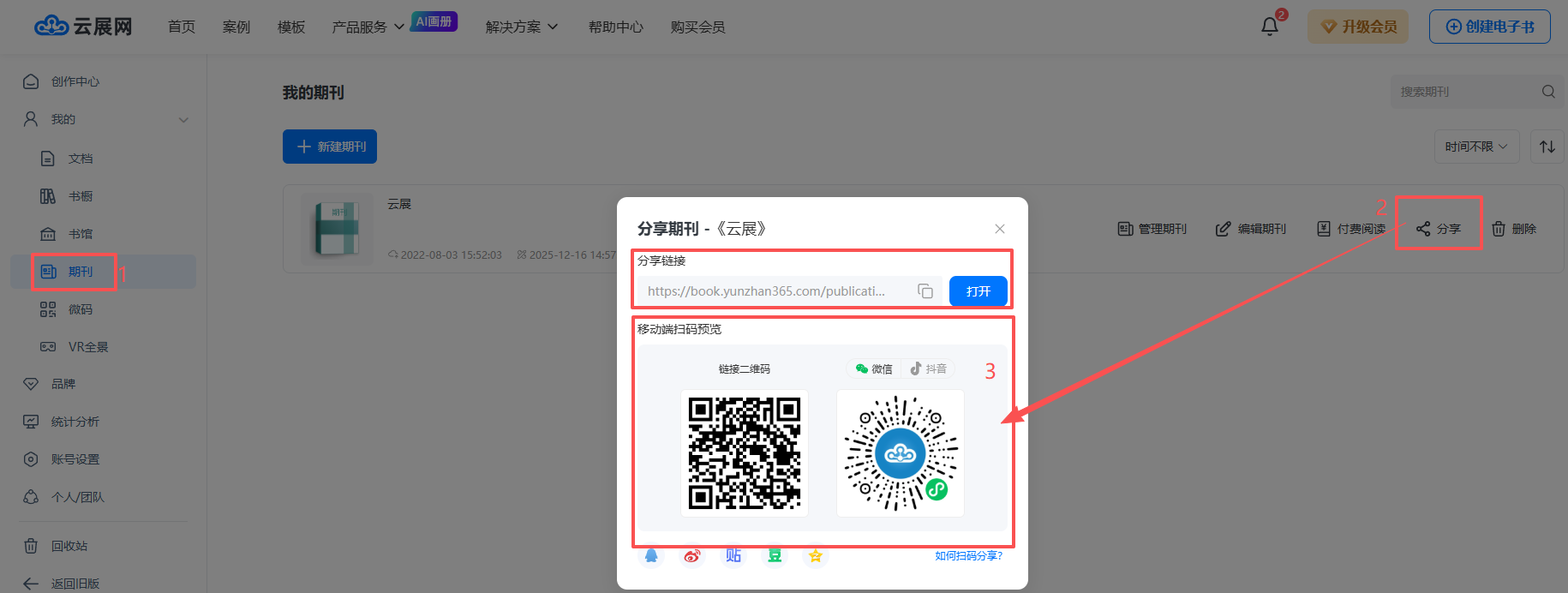 在【期刊】頁面,點(diǎn)擊【分享】,可以打開期刊鏈接預(yù)覽或者用手機(jī)掃碼期刊二維碼預(yù)覽。