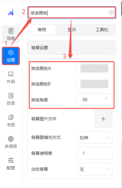 點(diǎn)擊【設(shè)置】,在上方搜索欄搜索【漸變顏色】,然后在下方【漸變顏色A】和【漸變顏色B】分別選擇一個顏色,最后調(diào)整【漸變角度】即可。