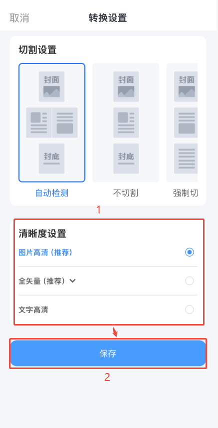 點擊右上角【轉換設置】,然后在【清晰度設置】選擇合適的清晰度類型后,點擊【保存】即可。