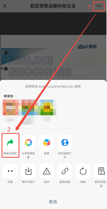 b)打開電子書后,點擊右上角三個點,選擇【轉(zhuǎn)發(fā)給好友】,即可分享出名片的形式。