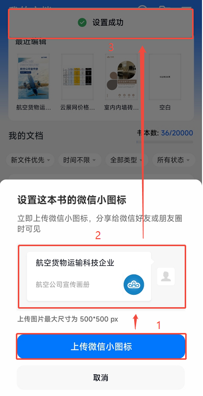 (2)點擊【上傳微信小圖標】,選擇手機里的圖片文件,支持上傳JPG/PNG/JPEG格式的圖片,推薦尺寸是200x200px,最大尺寸是500x500px,上傳成功后最上方會顯示設(shè)置成功,中間可以預覽分享到微信上的樣式。
