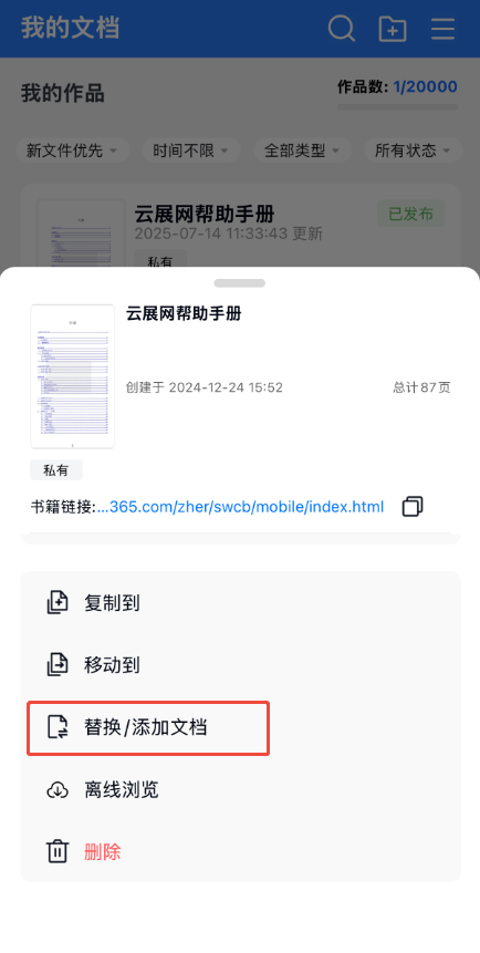 點(diǎn)擊【作品】,點(diǎn)擊對(duì)應(yīng)電子書右邊的三個(gè)點(diǎn),然后點(diǎn)擊【替換/添加文檔】,打開替換文檔界面。