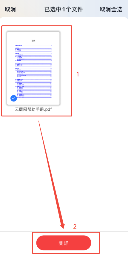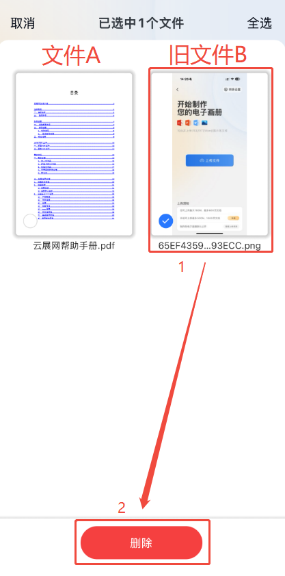 a)點(diǎn)擊右上角選擇按鈕,勾選舊文件,點(diǎn)擊【刪除】,將舊文件刪除掉。