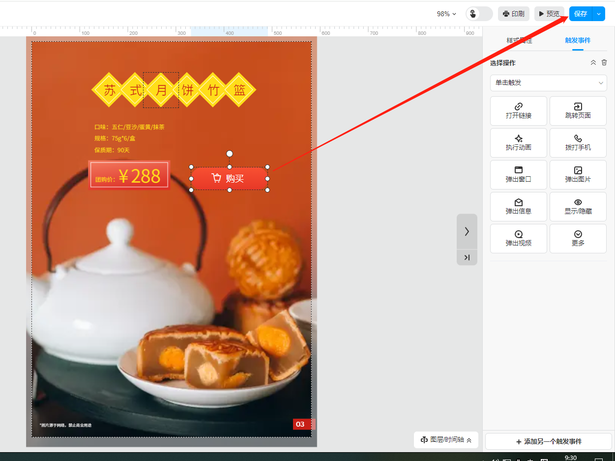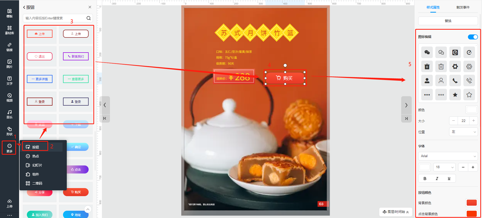 點(diǎn)擊【更多】,選擇【按鈕】,挑選一個(gè)功能按鈕,點(diǎn)擊便會(huì)出現(xiàn)在頁(yè)面上,移動(dòng)到合適的位置,雙擊按鈕可以更改文字,右側(cè)可更改其他樣式屬性。
