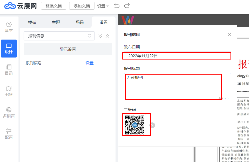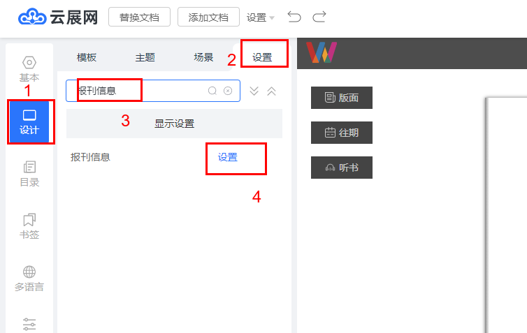 2、點(diǎn)擊【設(shè)計(jì)】,【設(shè)置】,搜索報(bào)刊信息,點(diǎn)擊【設(shè)置】