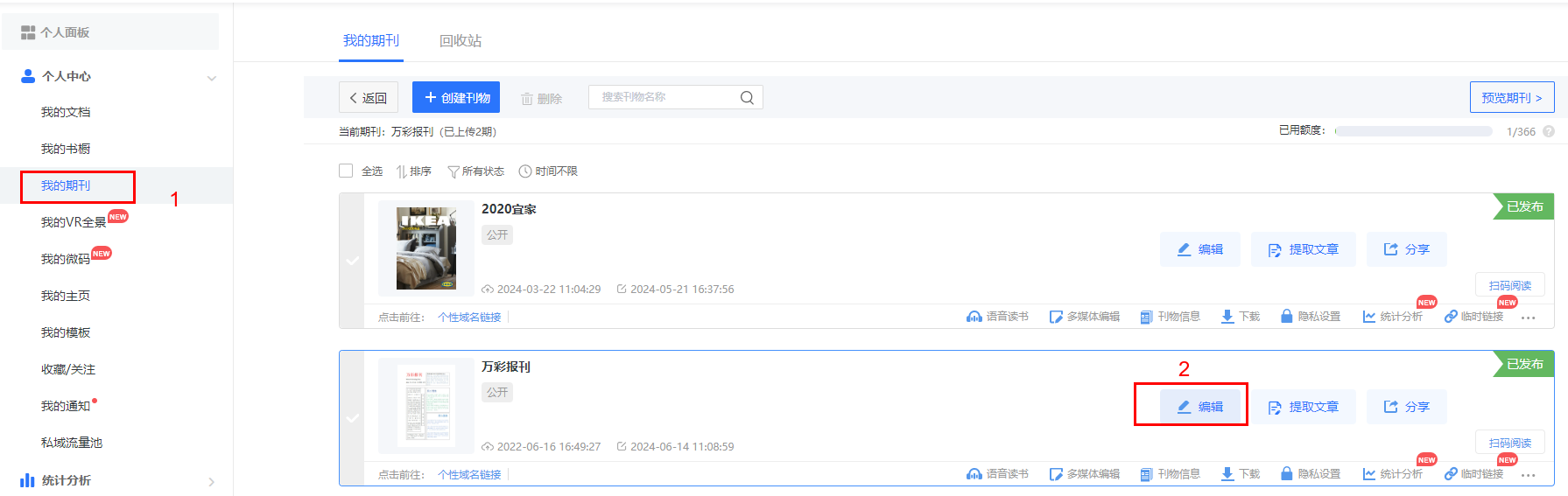 1、在【我的期刊】找到需要設(shè)置的書,點(diǎn)擊【編輯】