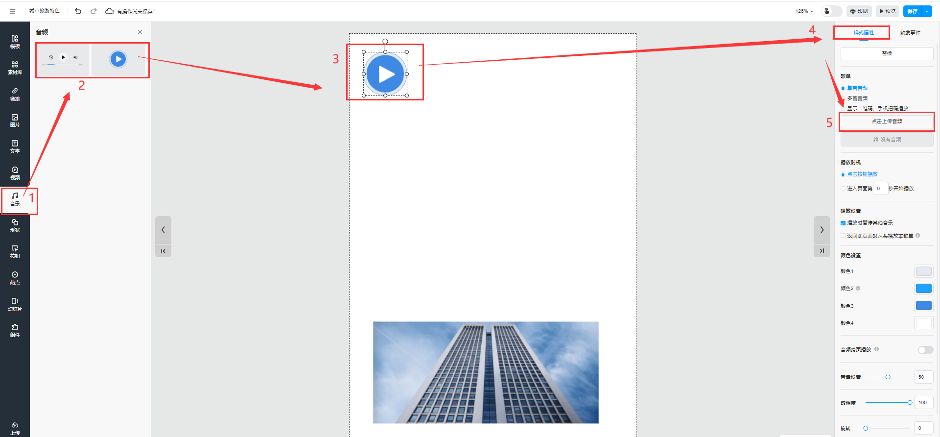 點(diǎn)擊【音樂】選擇音樂控件添加到頁面上,然后點(diǎn)擊【樣式屬性】,點(diǎn)擊【上傳音頻】,上傳mp3格式的音樂文件