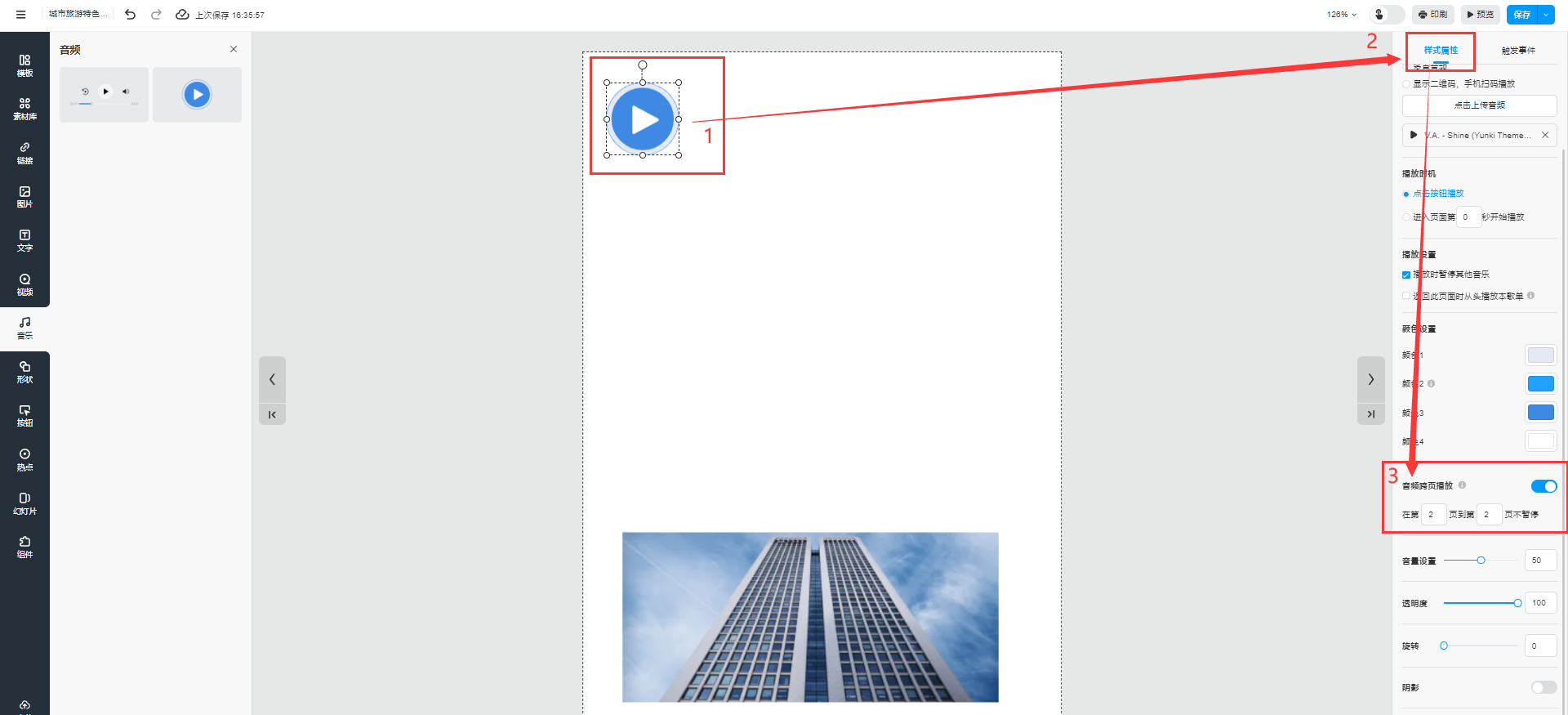 選中音頻播放器,點(diǎn)擊【樣式屬性】,勾選【音頻跨頁播放】,設(shè)置音頻跨頁播放的頁數(shù)