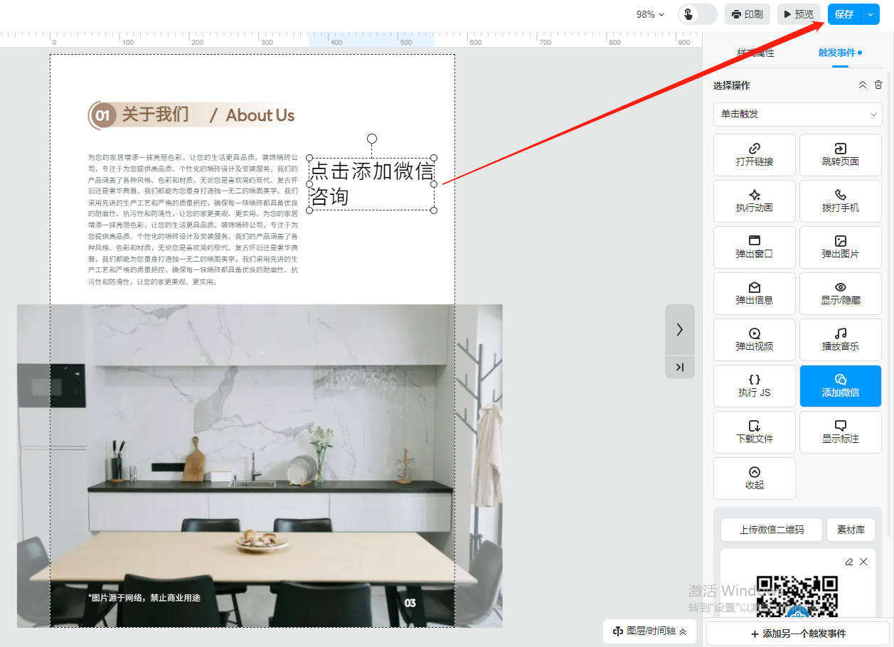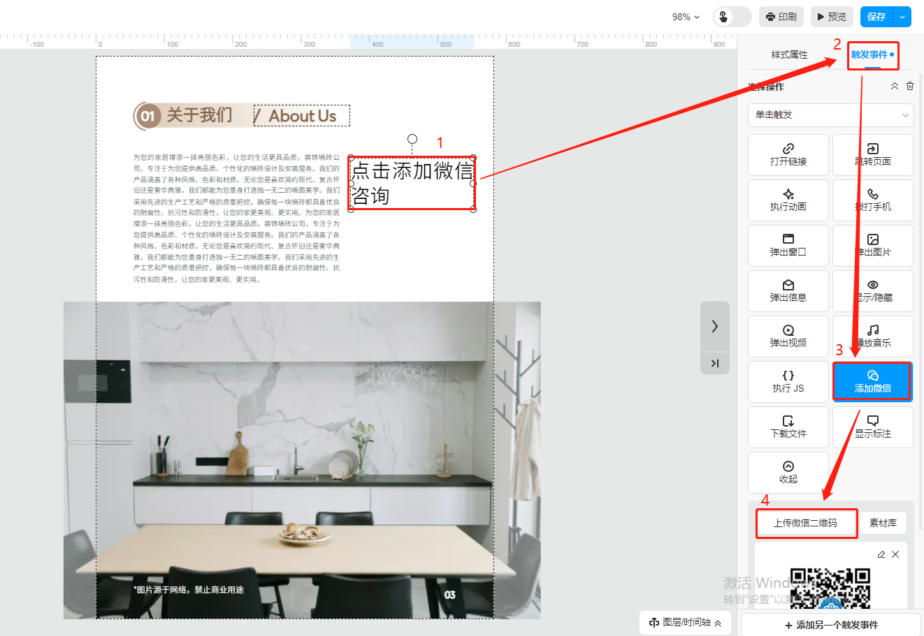 選中需要彈出微信二維碼的文字或者圖片,點擊右上角的【觸發(fā)事件】,選擇【添加微信】,然后點擊【上傳微信二維碼】上傳微信二維碼圖片。
