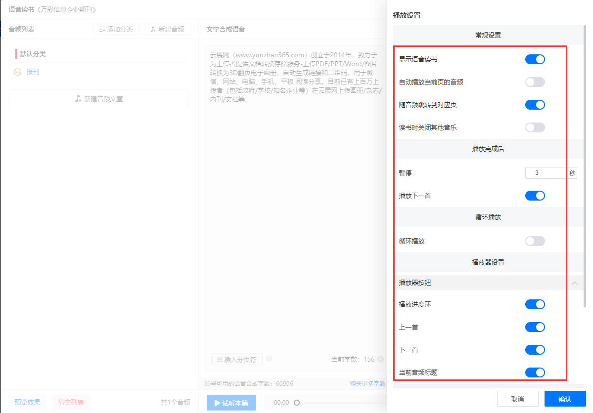語音讀書的播放設(shè)置,支持自定義設(shè)置語音播放器的logo,播放器樣式等,設(shè)置個性化的語音閱讀模式體驗。