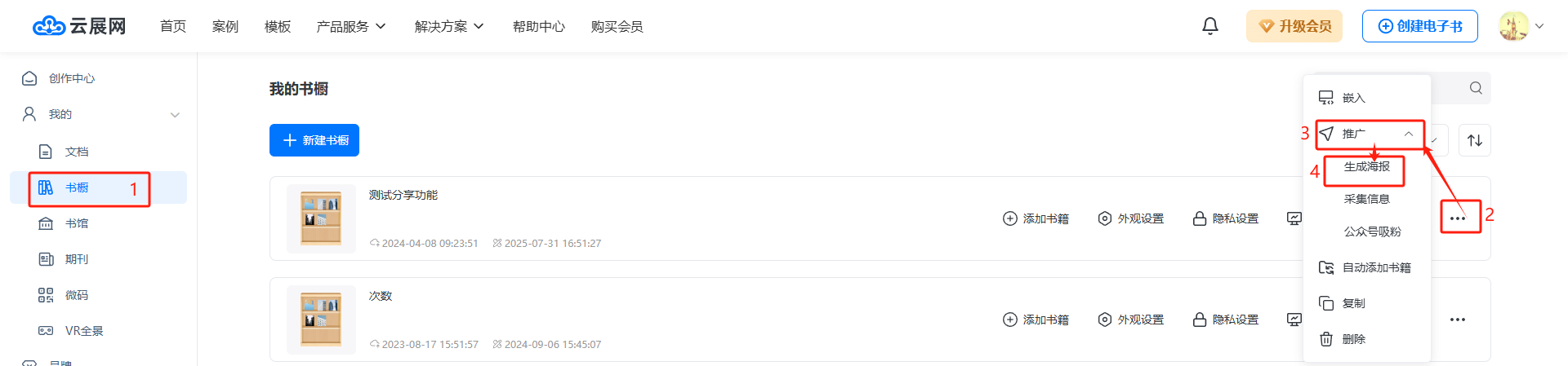在【書櫥】頁面,點(diǎn)擊右邊三個(gè)點(diǎn),隨后點(diǎn)擊【推廣】,點(diǎn)擊【生成海報(bào)】。
