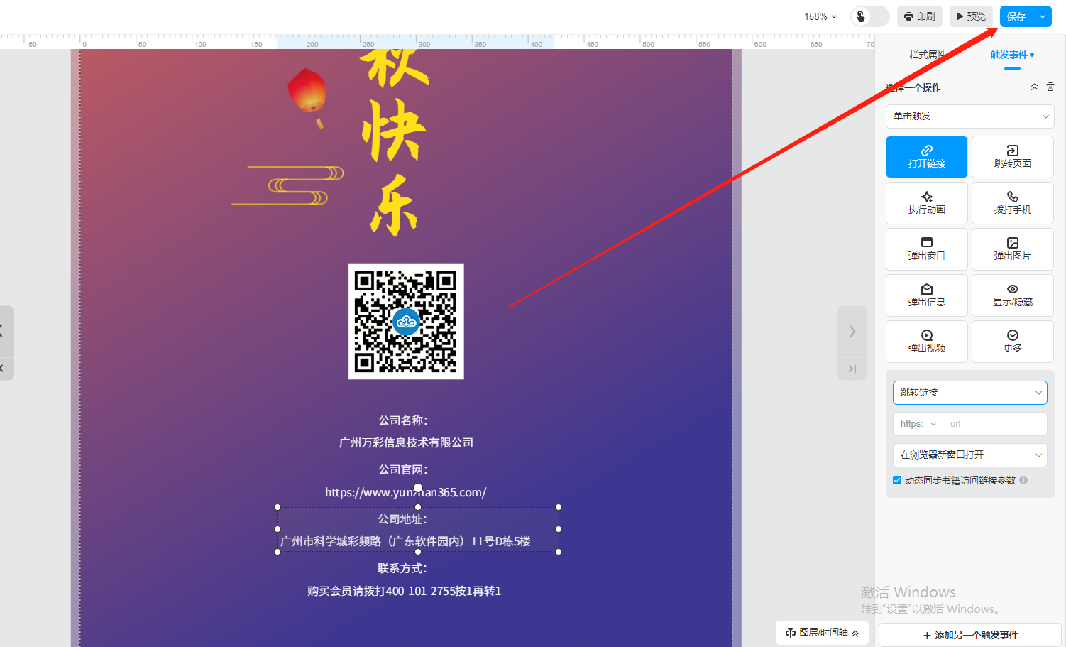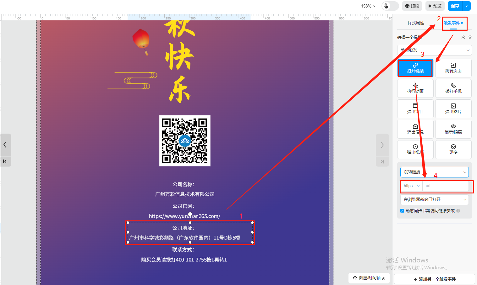 選中鏈接框,點擊【觸發(fā)事件】,然后選擇【打開鏈接】,下方輸入地圖目的地鏈接。