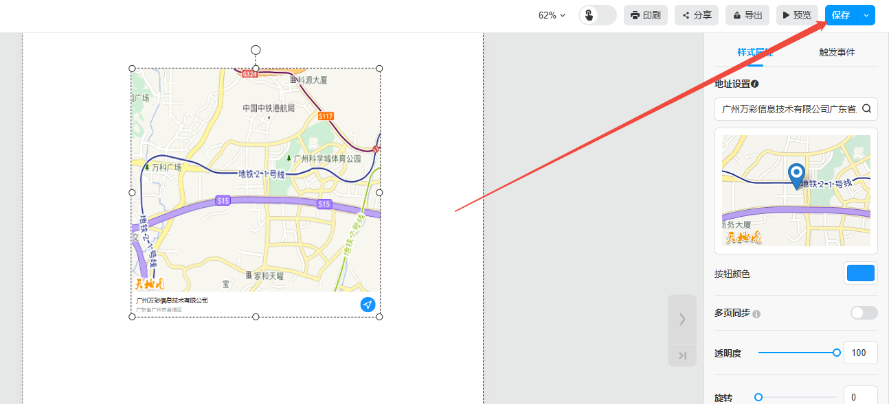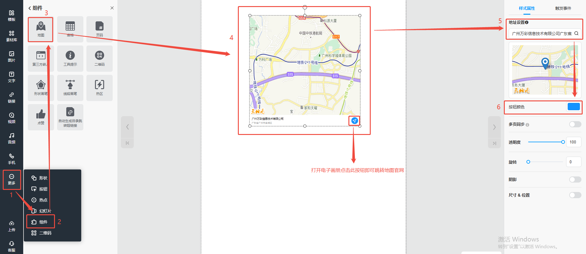 點擊【更多】,選擇【組件】,然后點擊【地圖】,在頁面上就會出現(xiàn)一個地圖板塊,在右側(cè)【地址設置】輸入目的地,設置【按鈕顏色】即可。