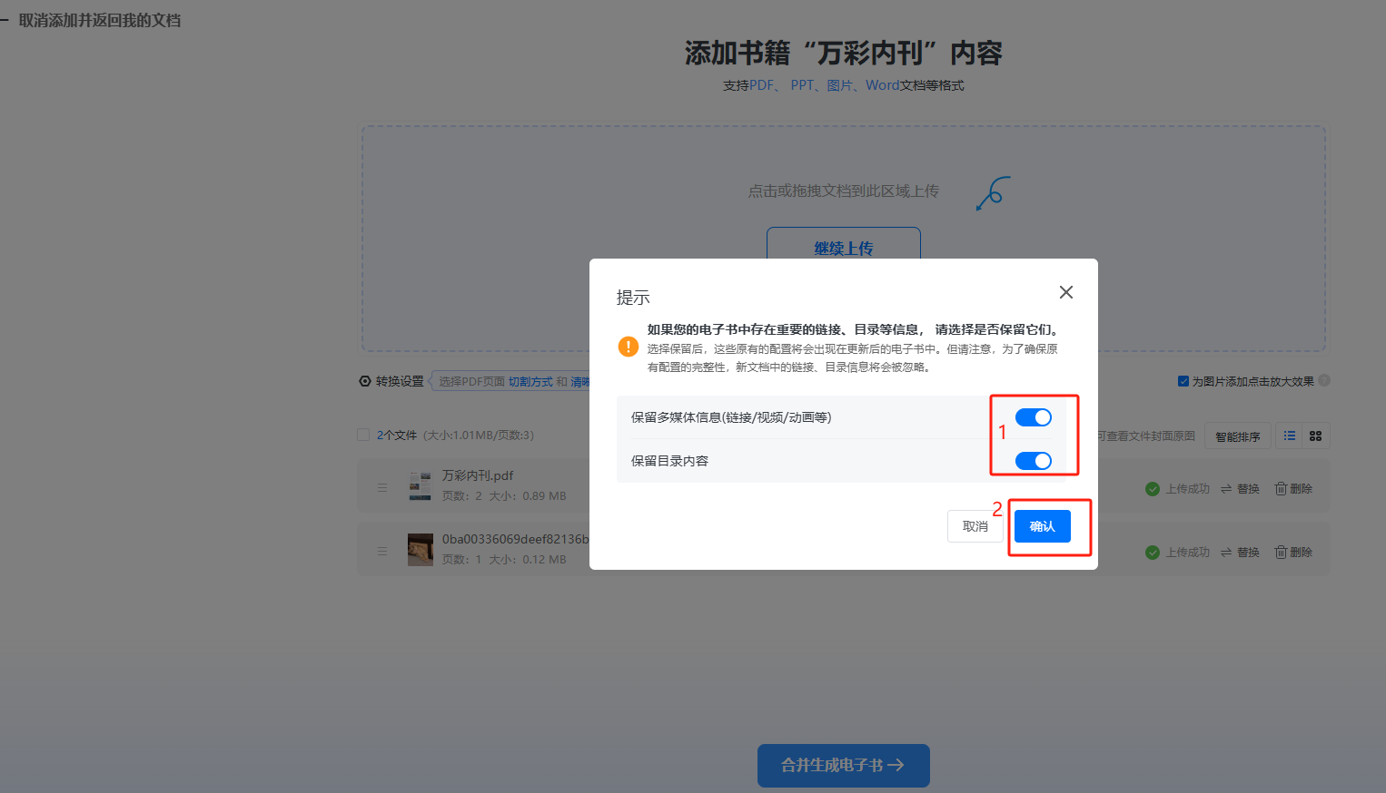 4、如果書(shū)本中有存在超鏈接/視頻/動(dòng)畫(huà)和目錄等功能,并且您需保留這些功能,請(qǐng)勾選“保留多媒體信息(鏈接/視頻/動(dòng)畫(huà)等)”和勾選”保留目錄內(nèi)容”,勾選后點(diǎn)擊【確認(rèn)】。