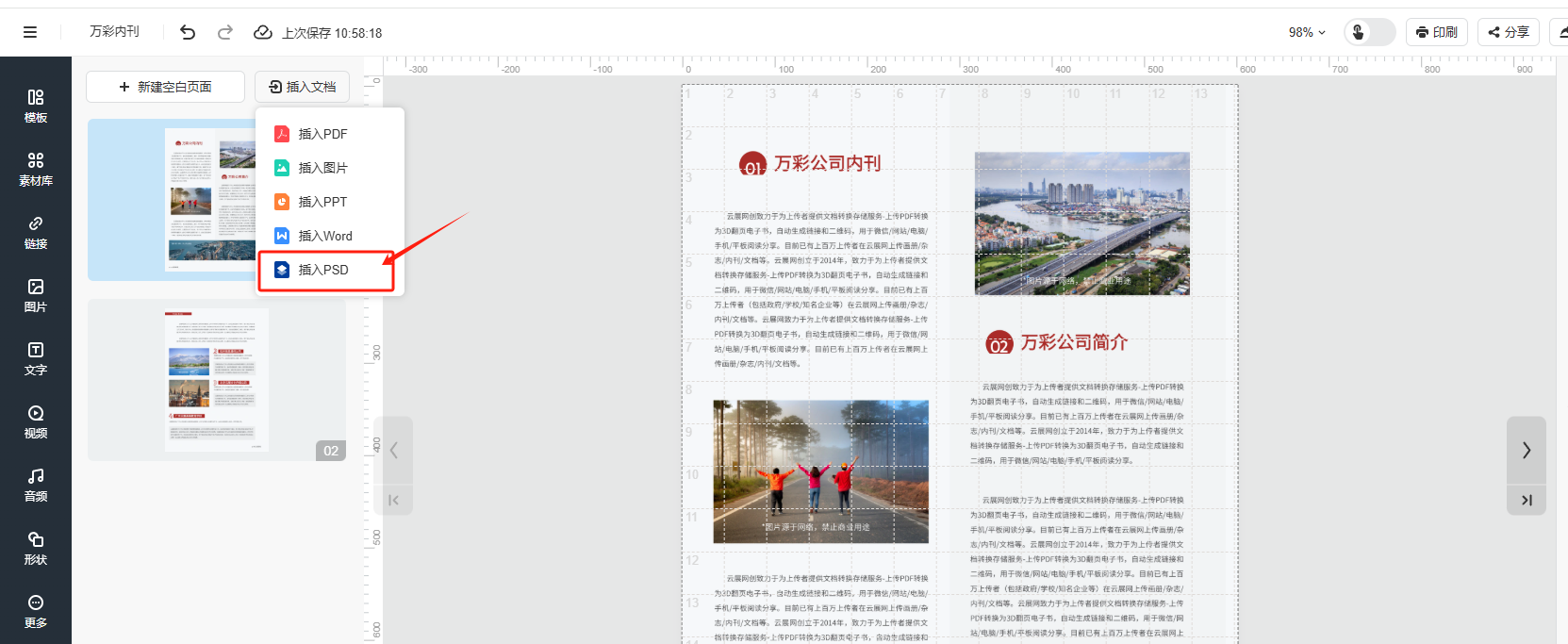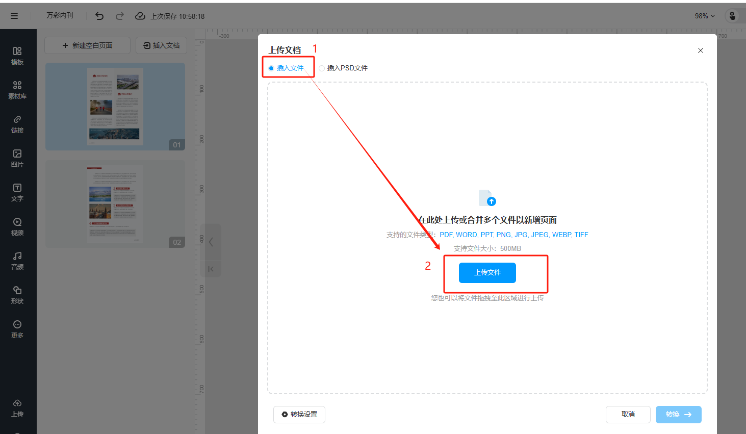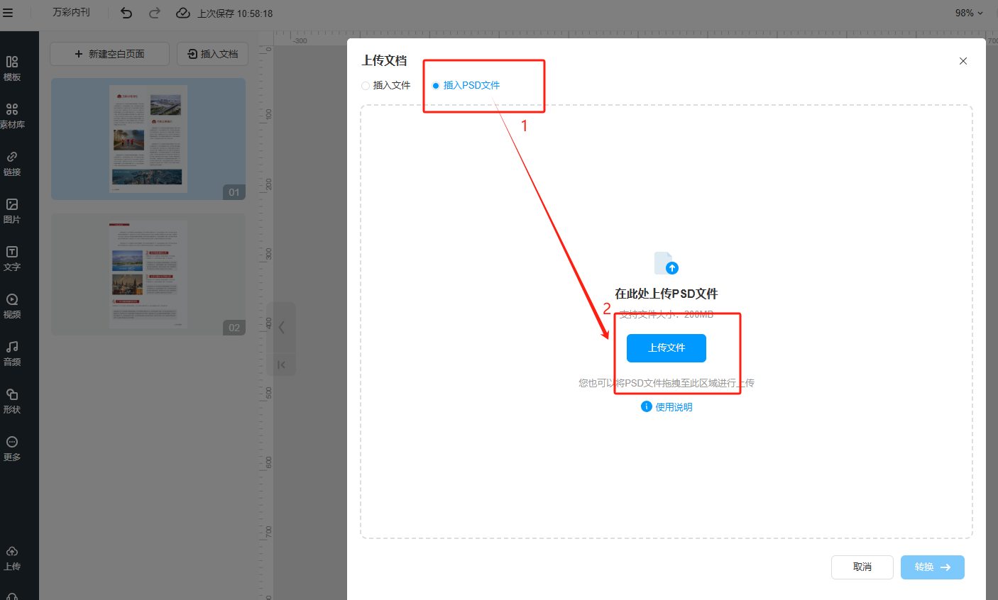 (b)插入PSD格式文件,在插入PSD頁(yè)面,點(diǎn)擊【上傳文件】上傳。