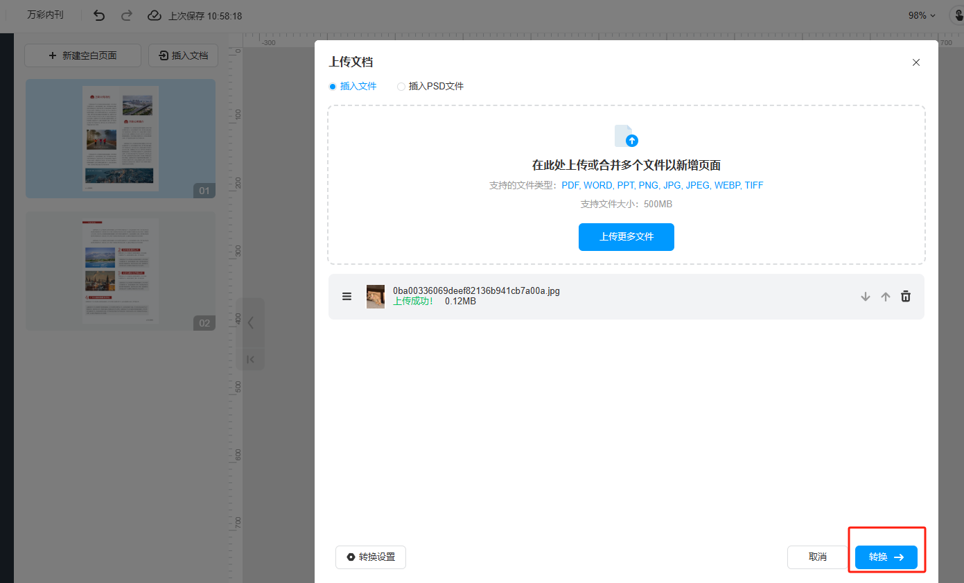 4、上傳好文檔后,點(diǎn)擊【轉(zhuǎn)換】。