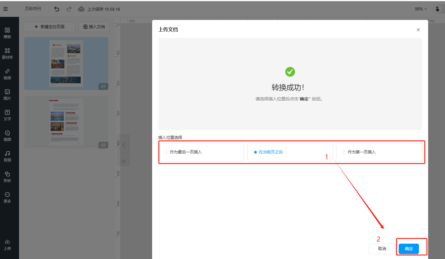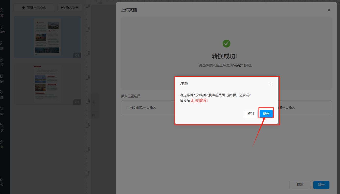 5、轉(zhuǎn)換成功后,選擇插入位置,然后點(diǎn)擊【確定】。