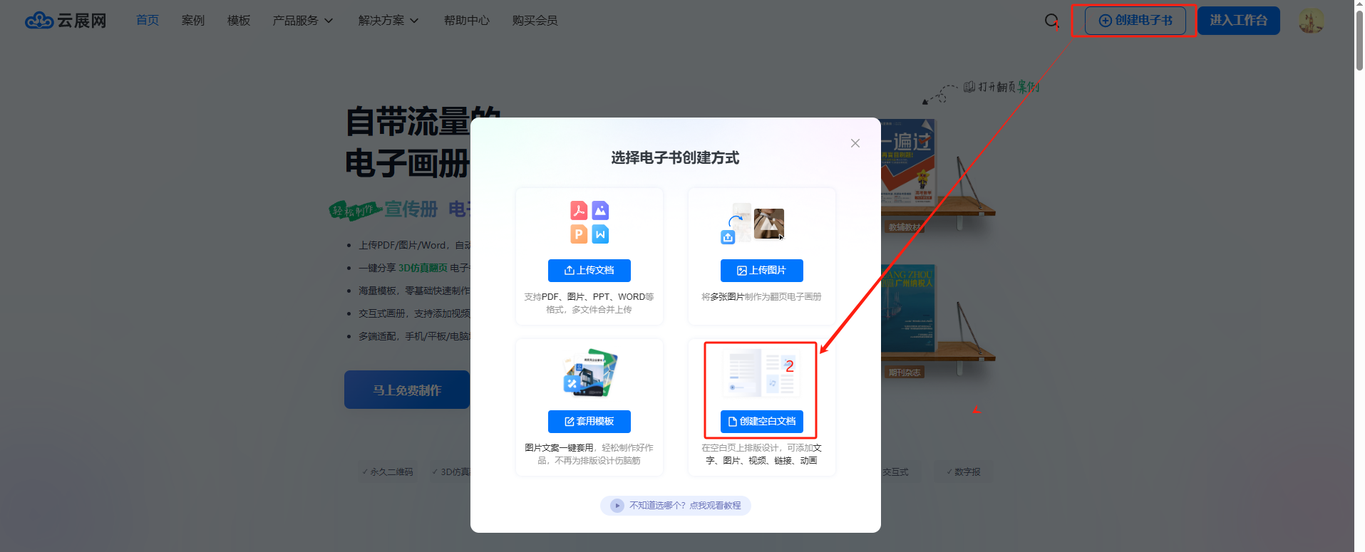創(chuàng)建空白文檔制作電子書。設(shè)置電子書標題和電子書尺寸,點擊完成創(chuàng)建后,即可進入【多媒體編輯器】。