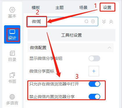 點(diǎn)擊【設(shè)計(jì)】,點(diǎn)擊【設(shè)置】,搜索框搜索【微信】,打開(kāi)以下兩個(gè)配置