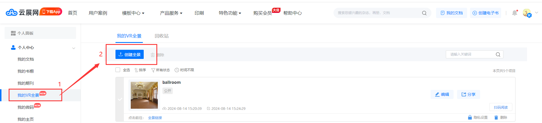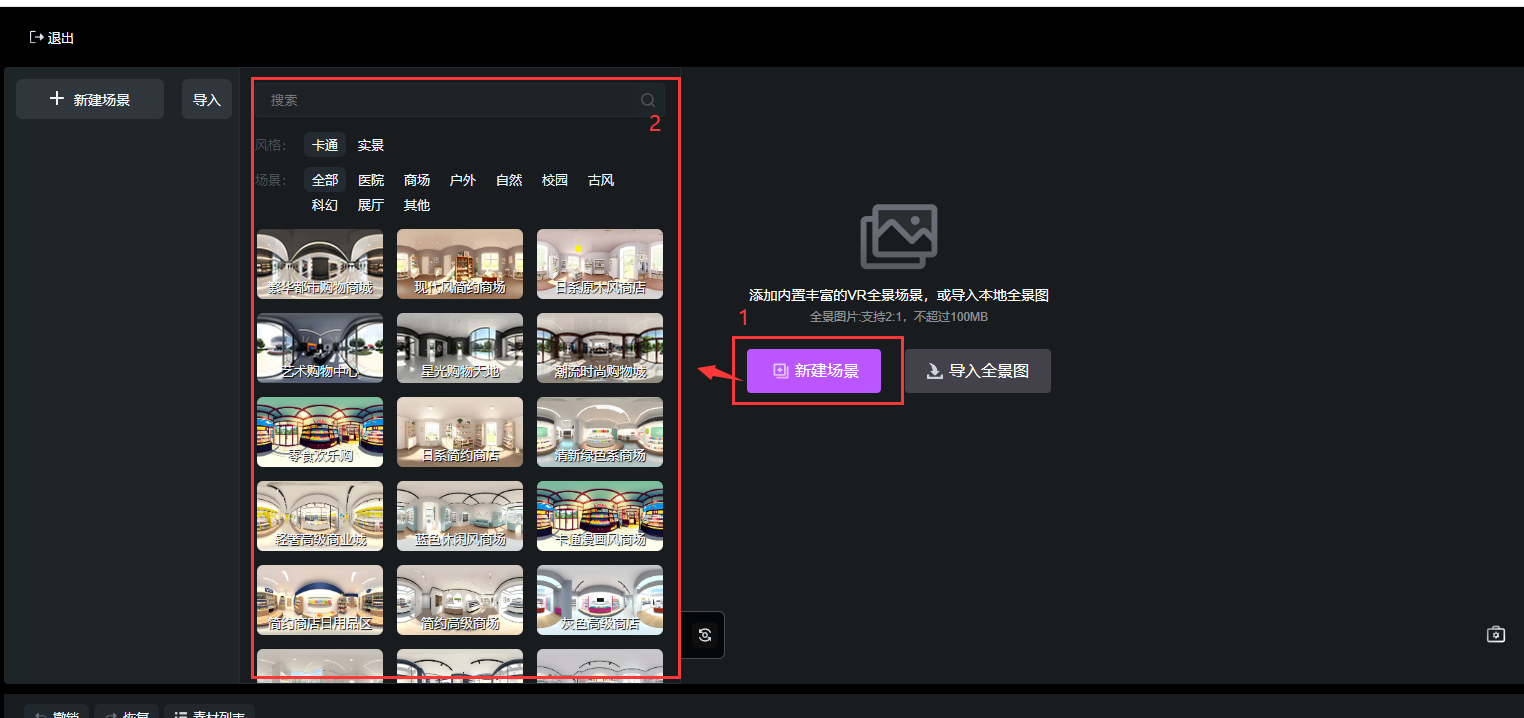 在【我的VR全景】頁面,點擊【創(chuàng)建全景】進入編輯頁面