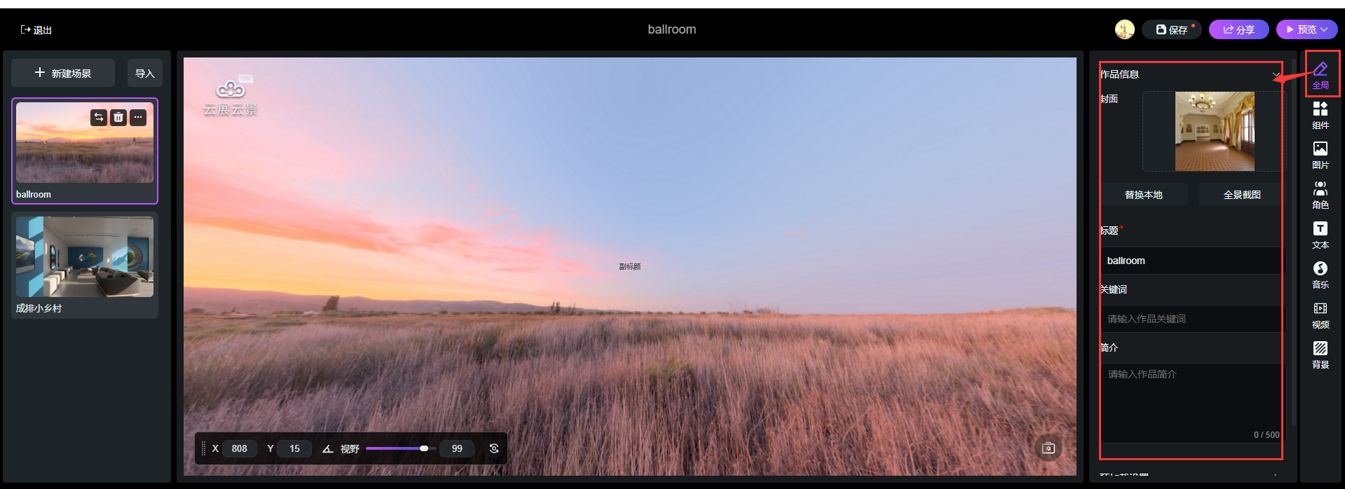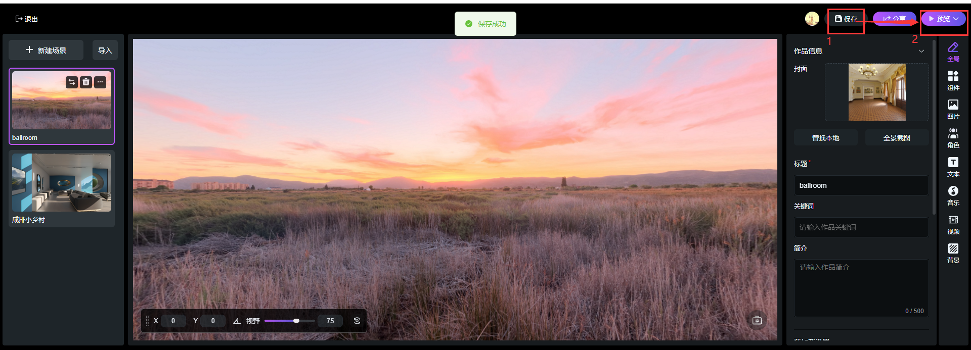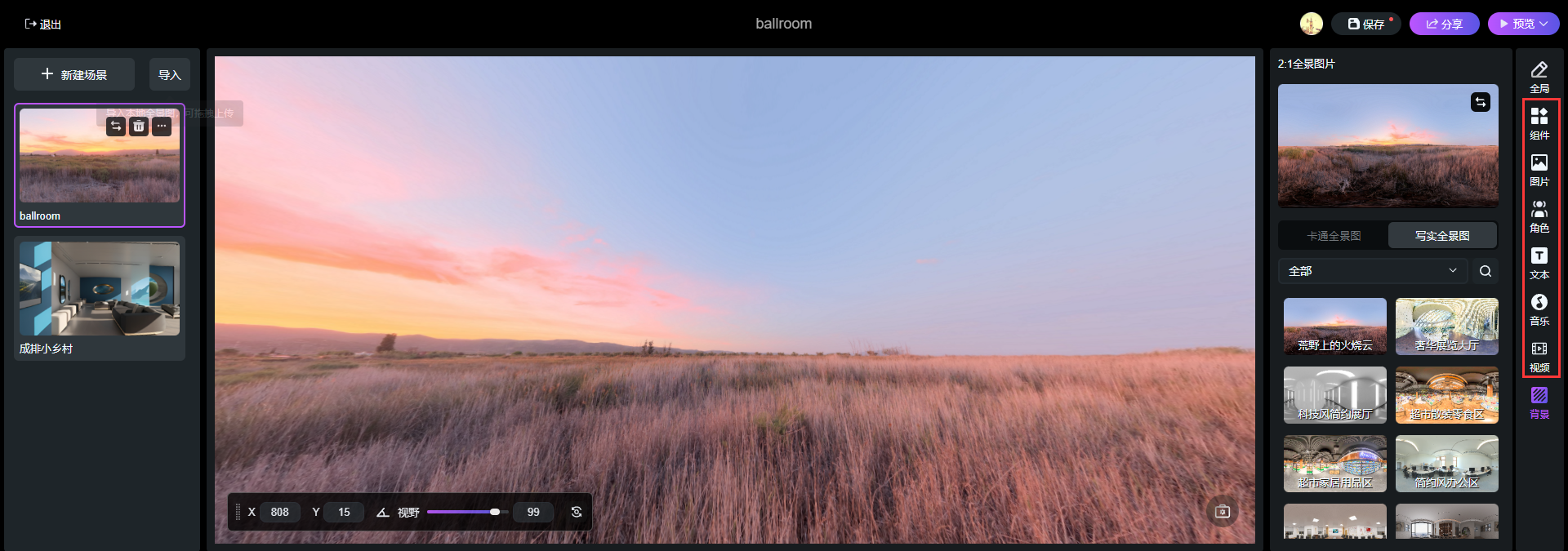 在頁面右側可設置組件、圖片、角色、文本、音樂、視頻等多種交互元素,滿足客戶的不同使用需求,同時可引導觀眾探索,增強故事敘述,使得虛擬體驗更加生動和有趣。