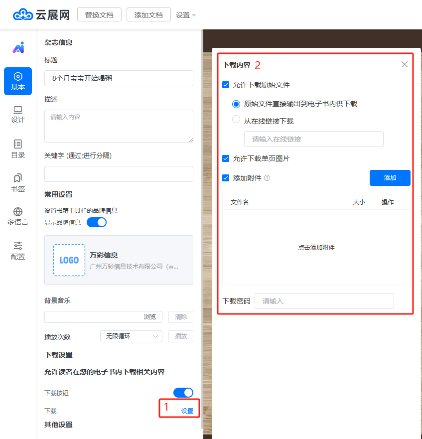 添加附件:允許讀者下載您添加的附件,附件支持的格式有:MP3、MP4、PDF、PPT、圖片、Word。