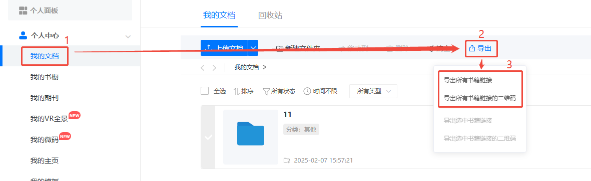 點擊【我的文檔】,點擊【導出】后,選擇導出所有書籍的鏈接或者二維碼,導出鏈接會得到一份excel表格,表格會顯示每一本電子書的標題、描述、鏈接以及創(chuàng)建時間,選擇導出二維碼會得到一份壓縮包,解壓之后即可查看所有書籍的二維碼。