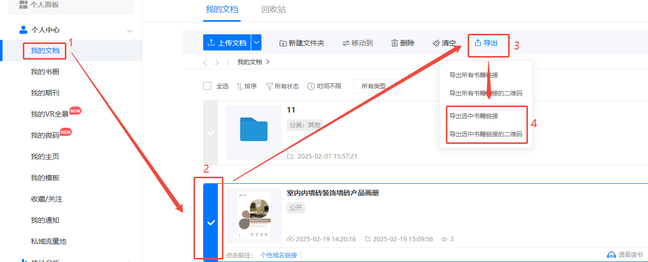 點擊【我的文檔】,勾選需要導出的書籍,點擊【導出】后,選擇導出選中書籍的鏈接或者二維碼,導出鏈接會得到一份excel表格,表格會顯示每一本電子書的標題、描述、鏈接以及創(chuàng)建時間,導出二維碼會得到一份壓縮包,解壓之后即可查看所選書籍的二維碼。