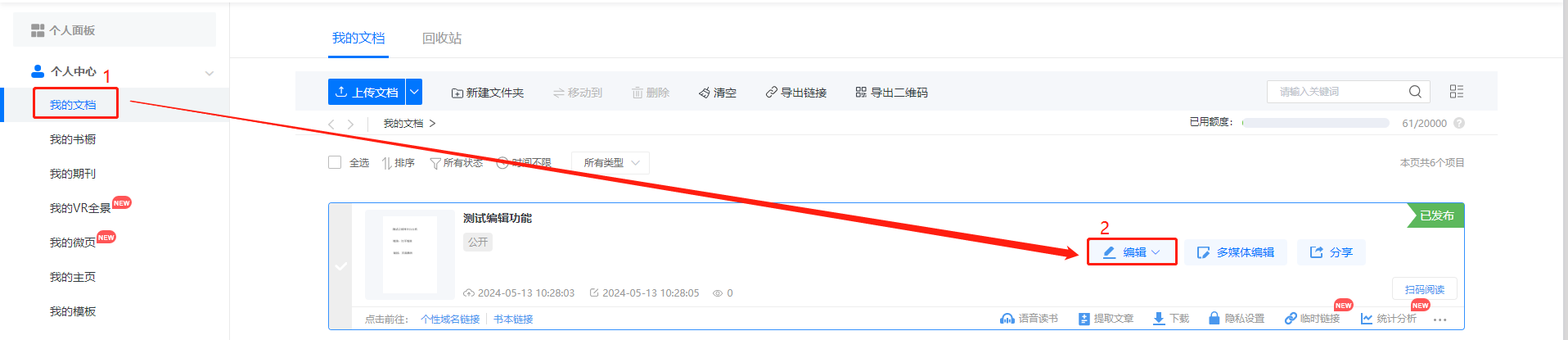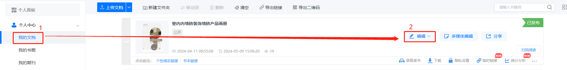 點(diǎn)擊【我的文檔】,點(diǎn)擊設(shè)置好配置的畫冊(cè)的【編輯】,打開編輯界面。