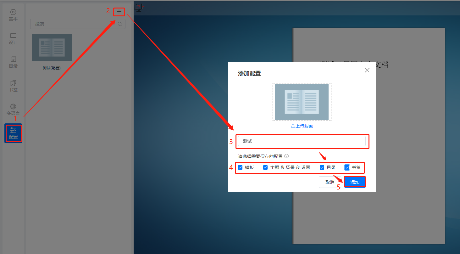 這個(gè)功能可以將畫冊(cè)設(shè)置的工具欄模板、主題、目錄、書簽作為配置保存下來,應(yīng)用到另一本畫冊(cè)上。