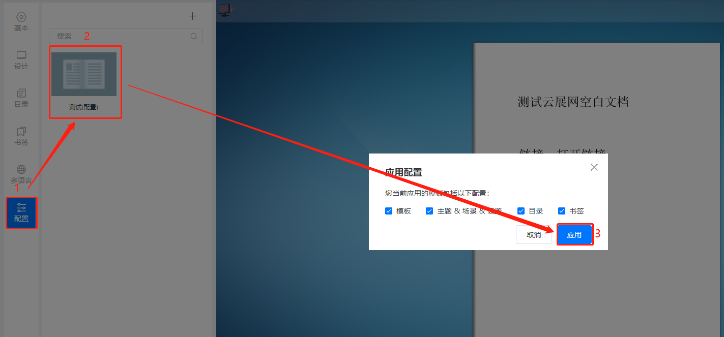(2)點(diǎn)擊【配置】,單擊保存的配置,點(diǎn)擊【應(yīng)用】,書本便會(huì)應(yīng)用保存的配置。