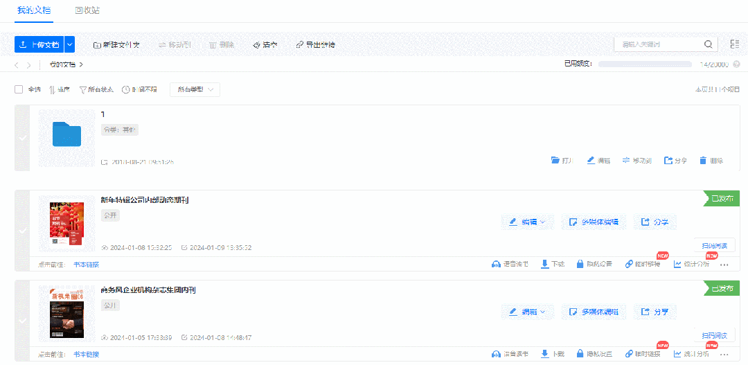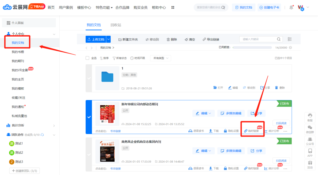1、點(diǎn)擊“我的文檔”選擇需要設(shè)置的電子畫冊(cè),點(diǎn)擊下方“臨時(shí)鏈接”可進(jìn)行設(shè)置。