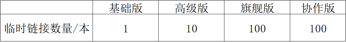 溫馨提示:“臨時(shí)鏈接”功能需基礎(chǔ)版及以上會(huì)員才可使用,各版本對(duì)于每本書可創(chuàng)建的臨時(shí)鏈接數(shù)量不不同,如圖: