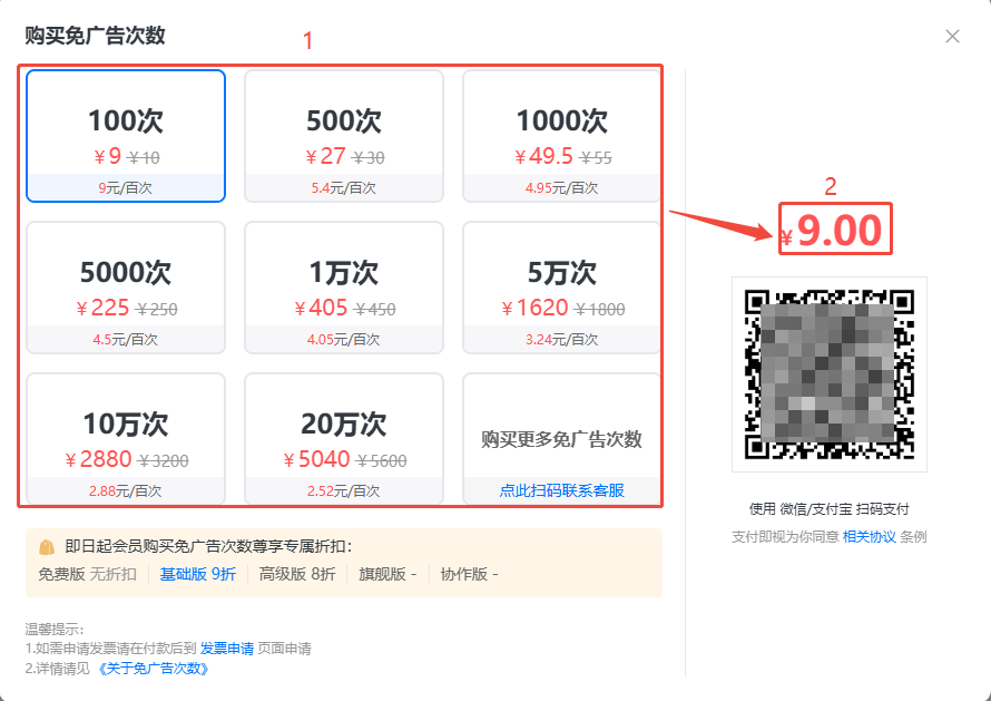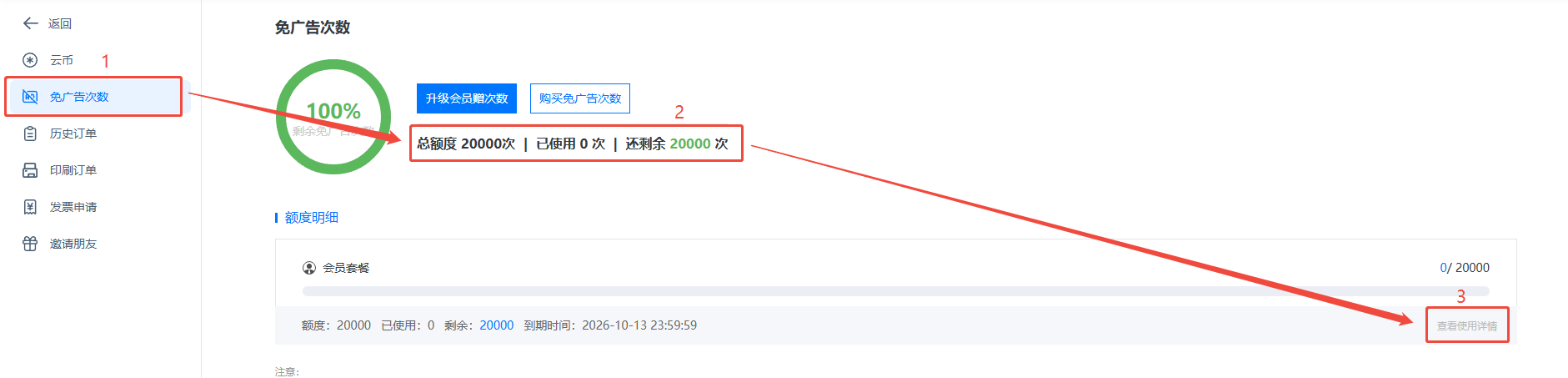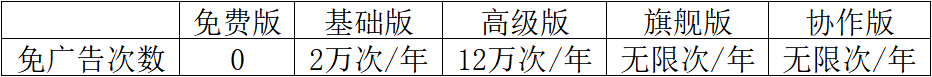 免廣告次數(shù)只在會員期間生效(如2017年5月4日開通一年基礎(chǔ)版,則次數(shù)的有效期為2017年5月4日到2018年5月4日),未用完的次數(shù)到期自動清零,到期前用完次數(shù)的建議升級更高級會員或者單獨充值次數(shù)(詳情請看第四點)。