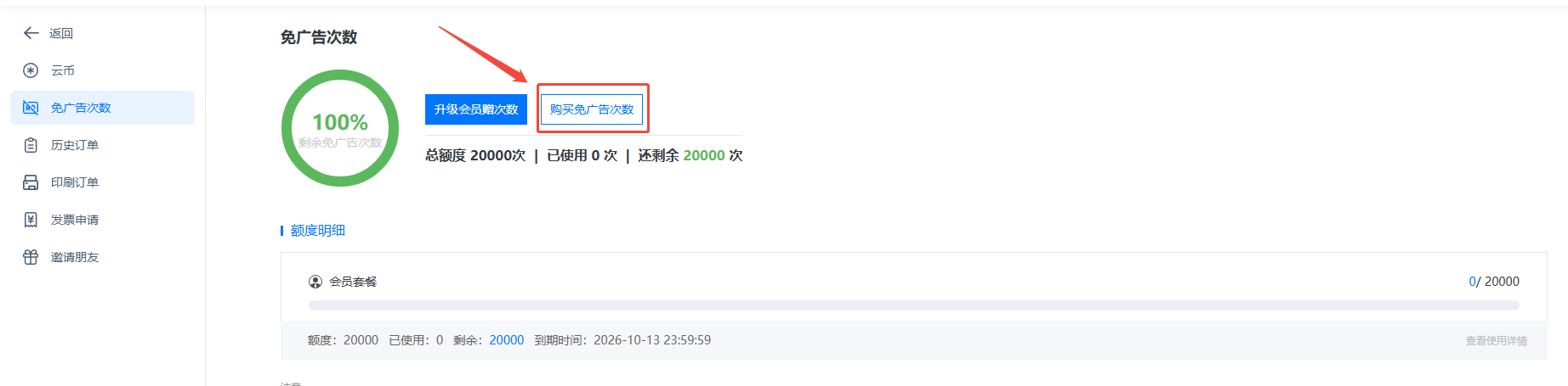 在官網(wǎng)點擊右上角頭像,再點擊【免廣告次數(shù)】,然后點擊【購買免廣告次數(shù)】,選擇需要購買的次數(shù)套餐付款后會自動加上。