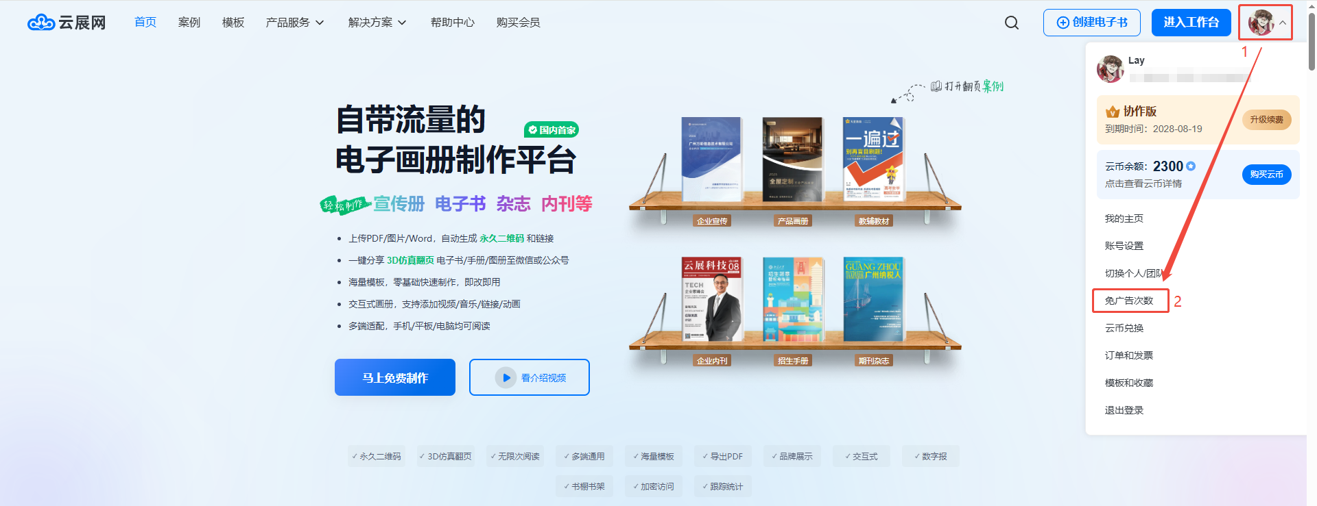 在官網(wǎng)點擊右上角頭像,再點擊【免廣告次數(shù)】就可以看到您書本的總免廣告次數(shù)以及剩余的免廣告次數(shù)。