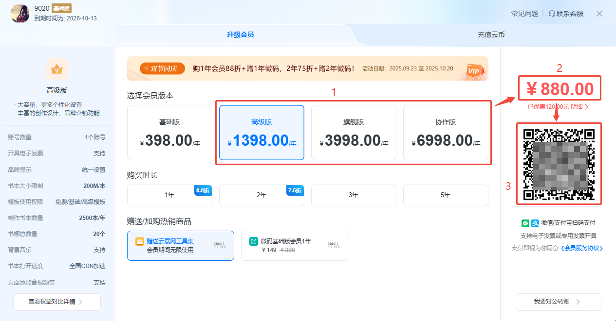 在官網(wǎng)點擊右上角頭像,點擊【升級續(xù)費】,選擇更高級會員,系統(tǒng)會自動計算差價,付款后自動升級。