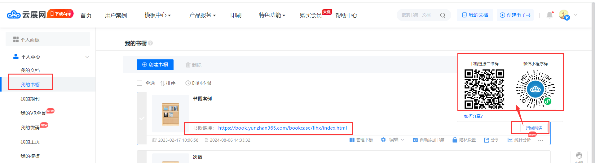 每個(gè)書櫥都有相應(yīng)的鏈接、二維碼以及小程序碼,在【我的書櫥】頁面,創(chuàng)建書櫥后自動生成,如下圖操作,可以查看到書櫥鏈接、二維碼和小程序碼