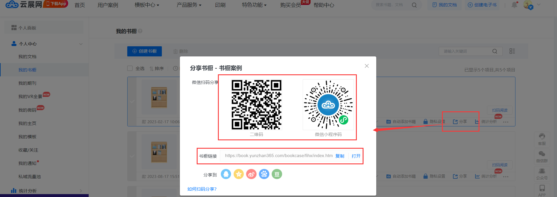 或者在【我的書櫥】頁面,點(diǎn)擊【分享】按鈕彈出彈窗,也可以看到書櫥鏈接、二維碼,以及小程序碼