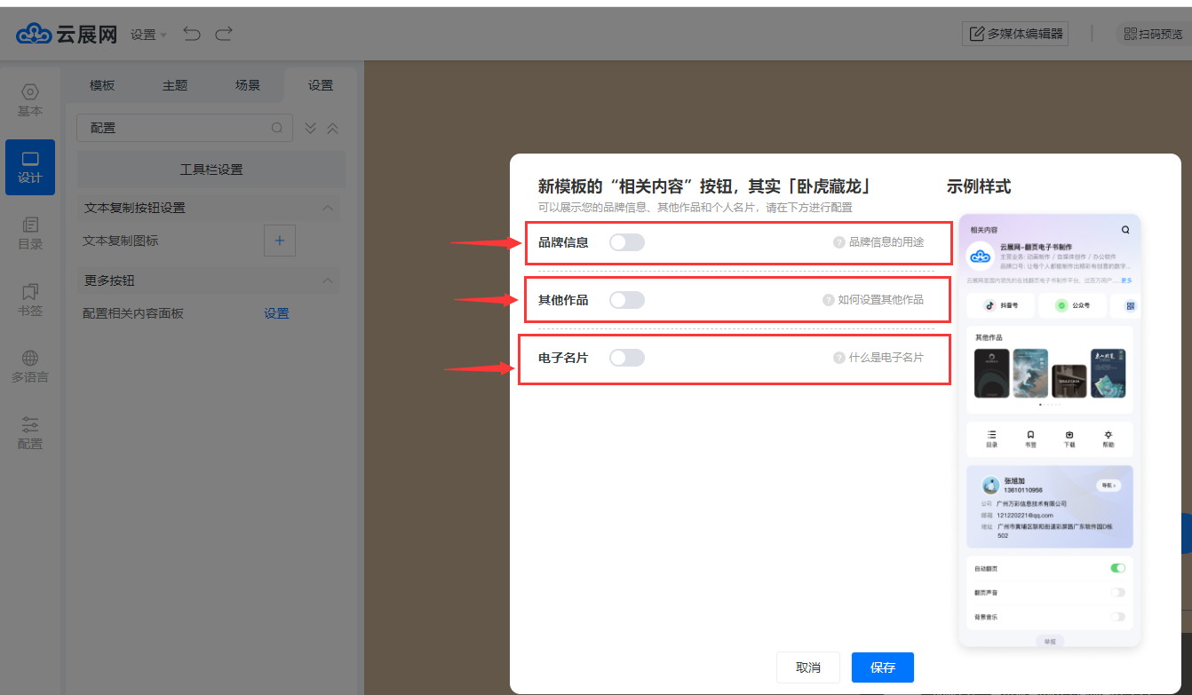 “相關(guān)內(nèi)容”面板功能有三個(gè),【品牌信息】、【其他作品】【電子名片】。
