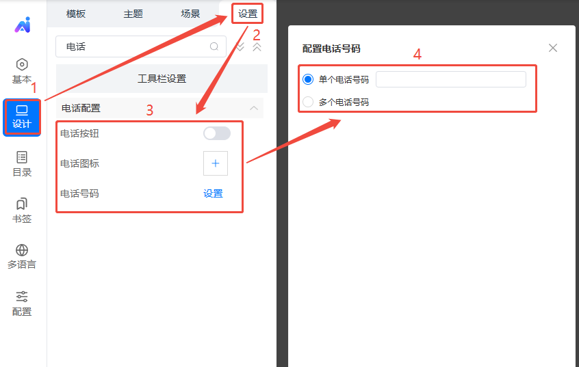點擊【設(shè)計】,然后點擊【設(shè)置】,打開【電話按鈕】,有需要可以自定義【電話圖標(biāo)】,輸入單個電話號碼或者多個電話號碼。